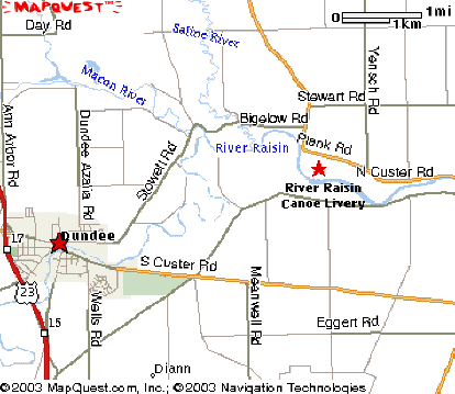Directions From U.S. 23 Take exit 17 (M-50) East. Turn left onto Main St. at the stoplight in Downtown Dundee. Main St. becomes Stowell Road. which becomes Bigelow Road. At Plank Road, turn right onto Plank Road. The entrance to River Raisin Canoe Livery will be on your right. |